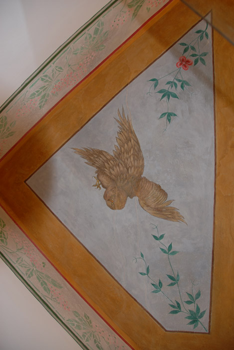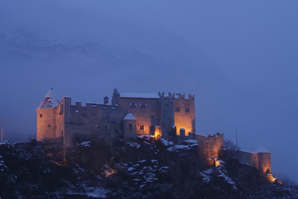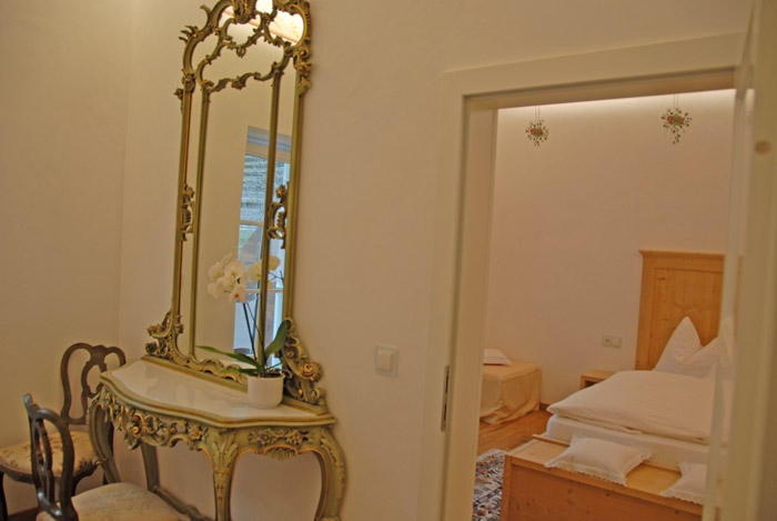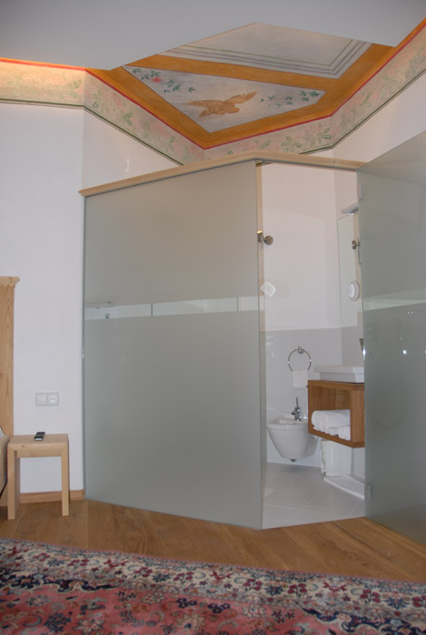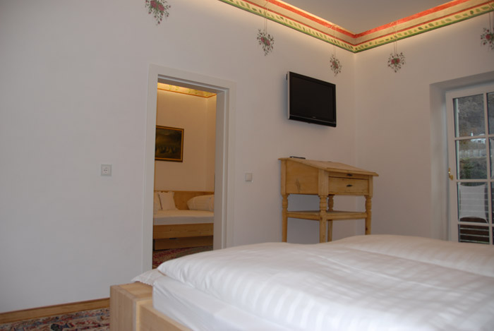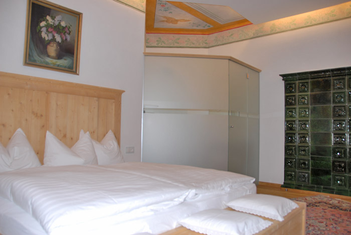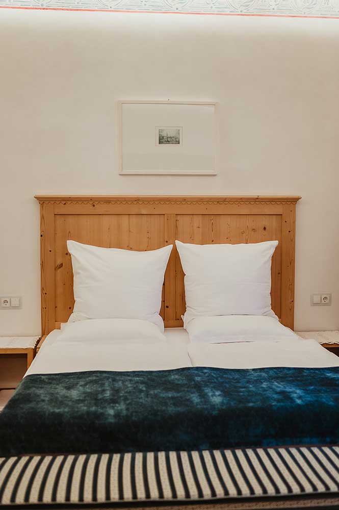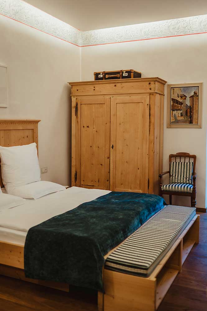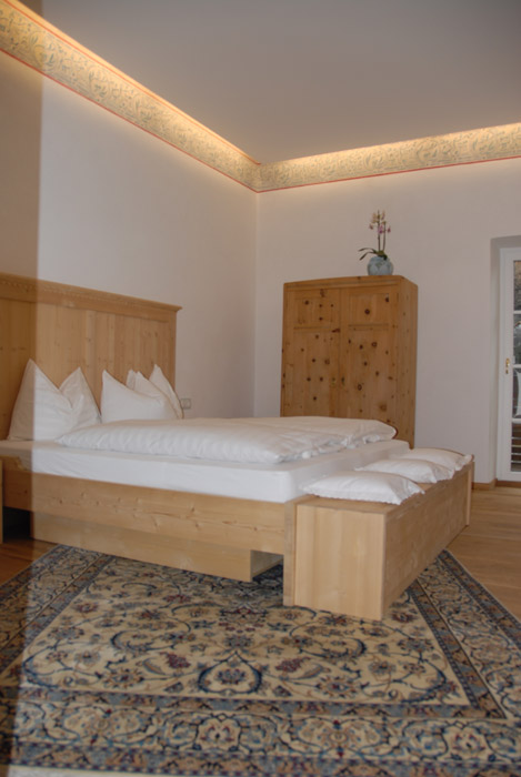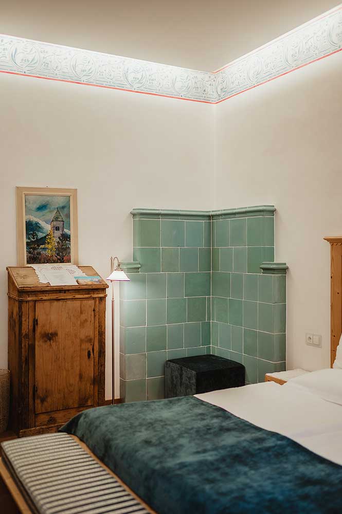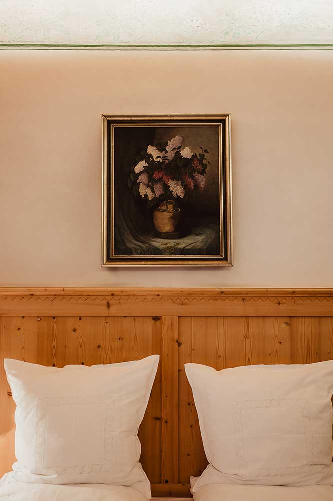 Unsere Zimmer laden auch über den gesunden Schlaf hinaus zum Verweilen ein. Jedes Zimmer ist individuell eingerichtet und gestaltet, mit Originalmalereien von großen Südtiroler Künstlern aus der Zeit der Jahrhundertwende. Damals wurde Kuppelrain ganz solide erbaut, vom Keller bis zum Dach aus massiven Steinen, Schiefer und Glimmer vom Sonnenberg. Eine Wand haben wir freigelegt, um die damalige großartige Kunst am Bau zu dokumentieren. Beim Restaurieren wurden nur Materialien aus unserer Umgebung verwendet, der Marmor mit dem weltweit unübertroffenen Weiß zum Beispiel stammt aus meiner Heimatgemeinde Laas im schönen Vinschgau. Als Kinder haben wir mit Marmorquadern gespielt, haben damit Burgen gebaut. Heute zieren eben diese Marmorquader, die mein Vater als junger Mann für unser Zuhause selbst gebrochen hat, den Aufgang zu unserem Restaurant. Das im Haus verwendete Holz aus heimischen Wäldern ist naturbelassen und wurde mit den vorhandenen alten Holzmöbeln zu einem harmonischen Ganzen kombiniert.